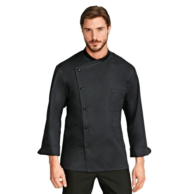 Veste de cuisine homme. Fermeture par boutons-pression. Œillets d'aération sous les bras. Longueur 72 cm. 65 % polyester, 35 % coton. Manches longues.