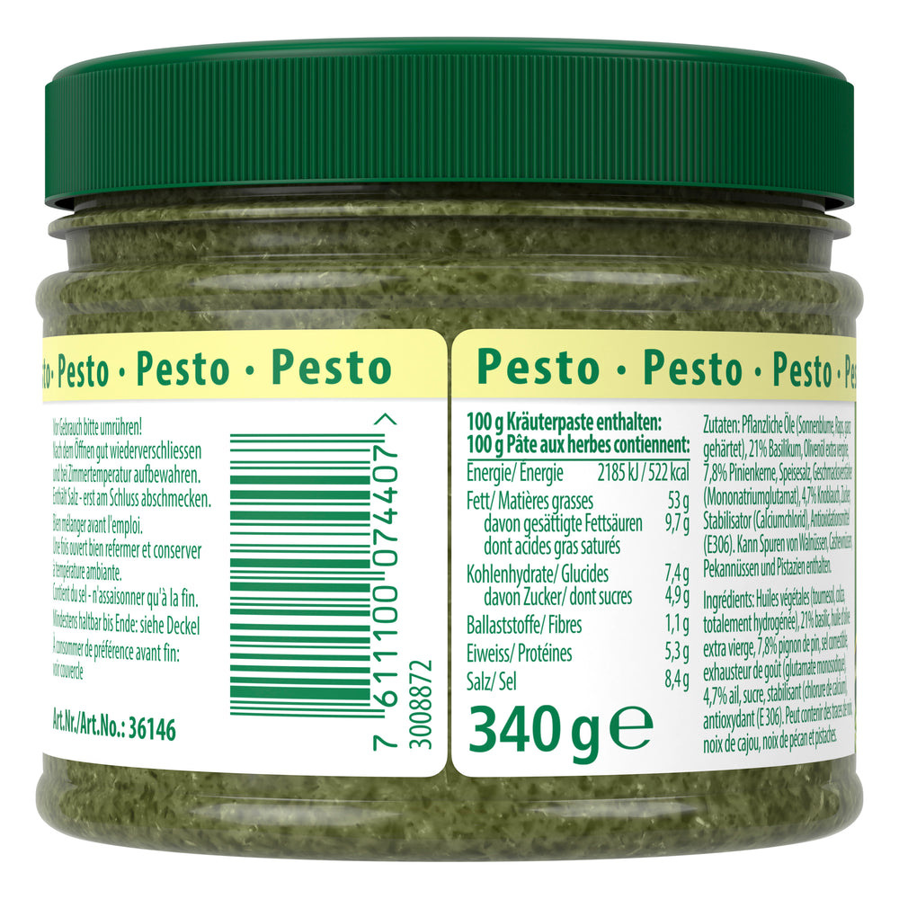 Ingrédients: Huiles végétales (tournesol, colza, totalement hydrogénée), 21% basilic, huile d'olive extra vierge, 7,8% pignon de pin, sel comestible, exhausteur de goût (glutamate monosodique), 4,7% ail, sucre, stabilisant (chlorure de calcium), antioxydant (E 306). Peut contenir des traces de noix, noix de cajou, noix de pécan et pistaches.