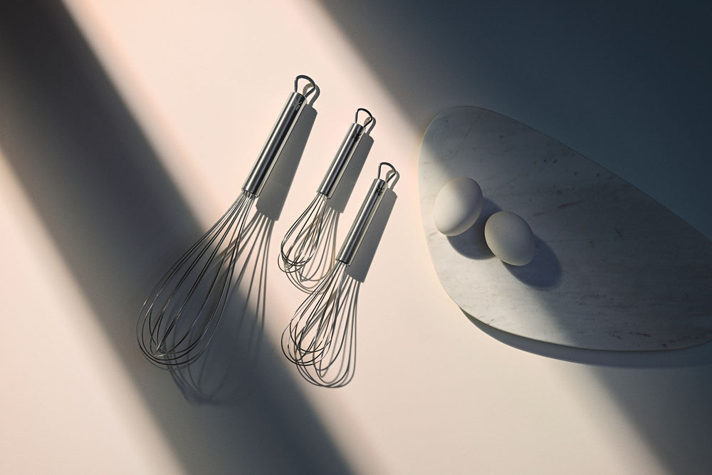 Les fouets Profi Plus impressionnent par leur design précis, quelle que soit leur taille. Grâce aux fils élastiques en forme de goutte et aux spirales fixés autour de la partie avant ovale, chaque recoin de la casserole ou du bol est facilement accessible sans risque de brûlure. Les ingrédients pour crèmes et autres desserts sont rapidement mélangés, les épices et l'huile sont incorporées dans de délicieuses marinades, le beurre est fondu facilement et rapidement dans de délicieuses sauces, et les œufs et la crème sont fouettés jusqu'à obtenir une consistance mousseuse. Fabriqués en acier inoxydable Cromargan® 18/10 élégant et durable, les fouets du set de 3 fouets Profi Plus (15, 20 et 30 cm) de WMF sont particulièrement robustes et durables. Ils passent bien sûr au lave-vaisselle pour un nettoyage facile et pratique.