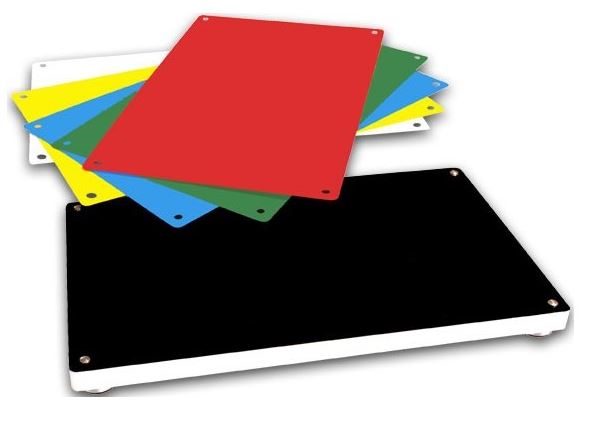 La particularité de cette planche à découper réside dans son ingénieux système de clic breveté en acier inoxydable. Vous découpez vos ingrédients crus sur les supports supérieurs, fermement fixés à la planche. Ces supports sont inodores et de qualité alimentaire. Fabriqués en PP (polypropylène) spécial, ils sont disponibles en six couleurs différentes, conformément aux directives HACCP. Ce système permet d'utiliser un support différent pour chaque produit, évitant ainsi le mélange des germes présents dans le poisson, la viande ou la volaille. Les risques de salmonelles et de campylobactéries sont ainsi minimisés. La couleur noire s'adapte à différentes présentations. Vos couteaux ne s'émousseront pas. Des traces de coupe apparaîtront naturellement sur les supports. Mais ce n'est pas un problème, car vous pouvez utiliser les supports des deux côtés. Au quotidien, vous pouvez couper de chaque côté pendant environ 8 à 10 semaines (!).