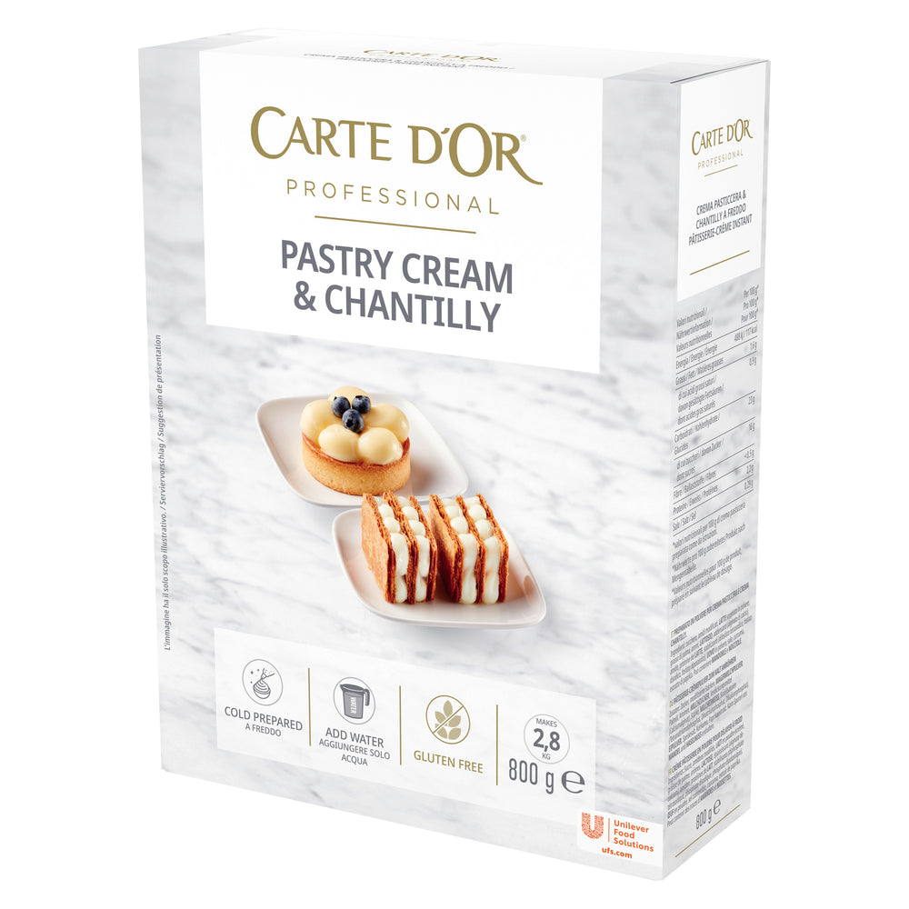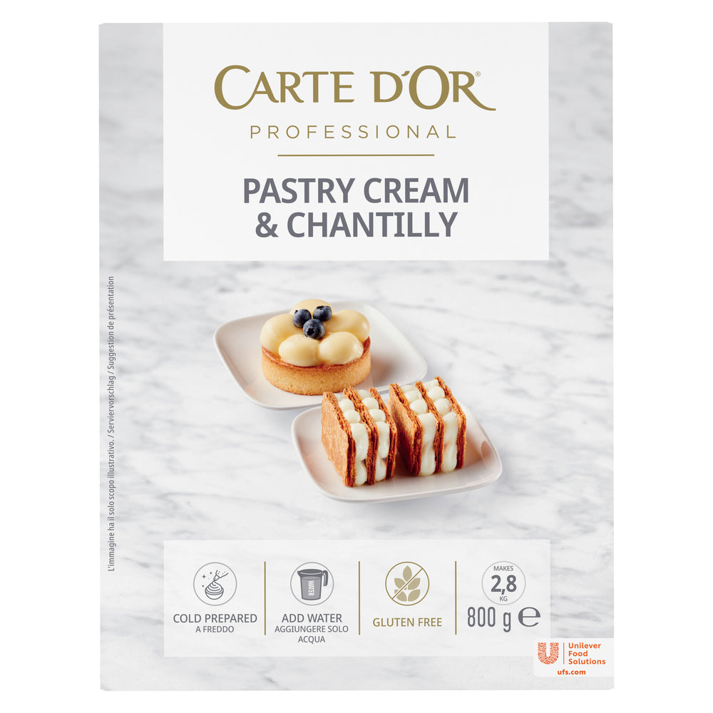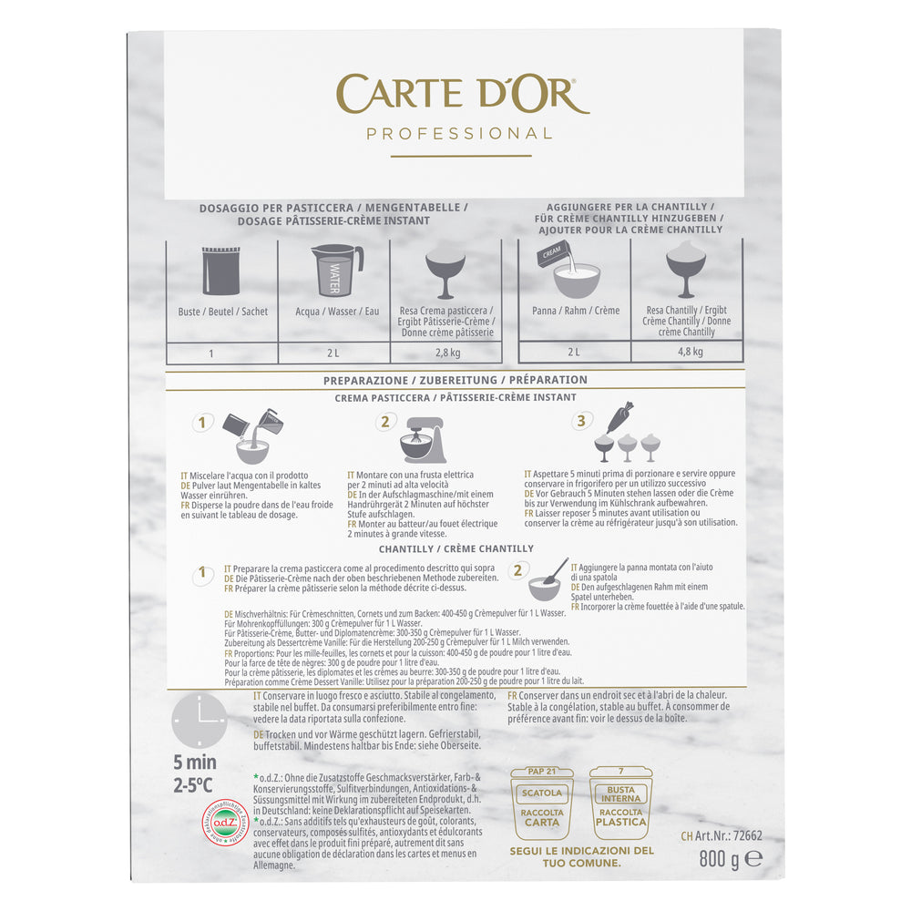 ZUBEREITUNG PÂTISSERIE-CRÈME INSTANT 1. Pulver laut Mengentabelle in kaltes Wasser einrühren. 2. In der Aufschlagmaschine/mit einem Handrührgerät 2 Minuten auf höchster Stufe aufschlagen. 3. Vor Gebrauch 5 Minuten stehen lassen oder die Crème bis zur Verwendung im Kühlschrank aufbewahren. CRÈME CHANTILLY 1. Die Pâtisserie-Crème nach der oben beschriebenen Methode zubereiten. 2. Den aufgeschlagenen Rahm mit einem Spatel unterheben. Mischverhältnis: Für Crèmeschnitten, Cornets und zum Backen: 400-450 g Crèmepulver für 1 L Wasser. Für Mohrenkopffüllungen: 300 g Crèmepulver für 1 L Wasser. Für Pâtisserie-Crème, Butter- und Diplomatencrème: 300-350 g Crèmepulver für 1 L Wasser. Zubereitung als Dessertcrème Vanille: Für die Herstellung 200-250 g Crèmepulver für 1 L Milch verwenden.