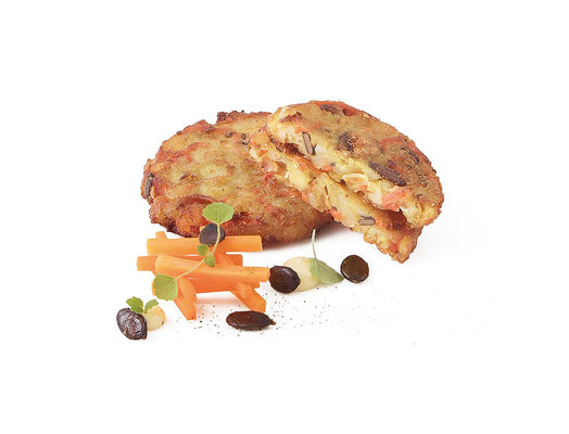 Kartoffel-Rösti mit Kürbiskernen und Karottenstreifen, vorfrittiert, tiefgekühlt