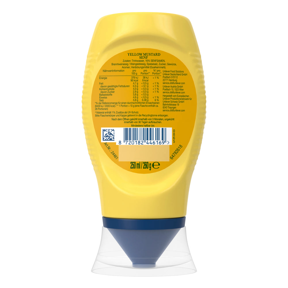 Zutaten: Trinkwasser, 16% SENFSAMEN, Branntweinessig / Weingeistessig, Speisesalz, Zucker, Gewürze, Aromen, Verdickungsmittel (Guarkernmehl).