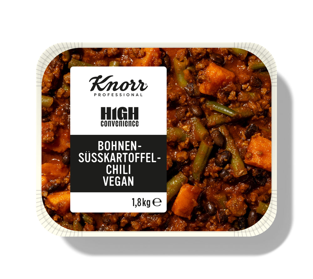 Chiligericht mit veganem Gehackten/Faschiertem auf Soja-Basis, schwarzen und grünen Bohnen und Süßkartoffeln, tiefgefroren