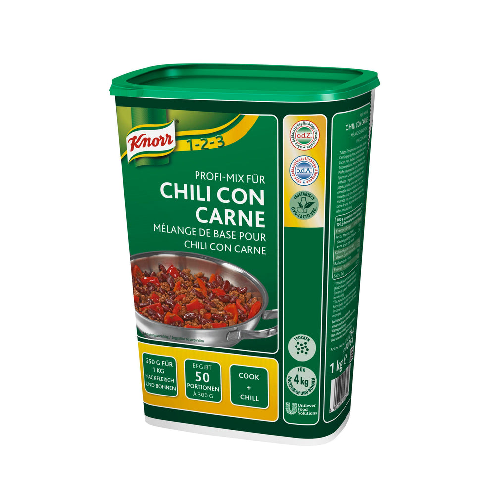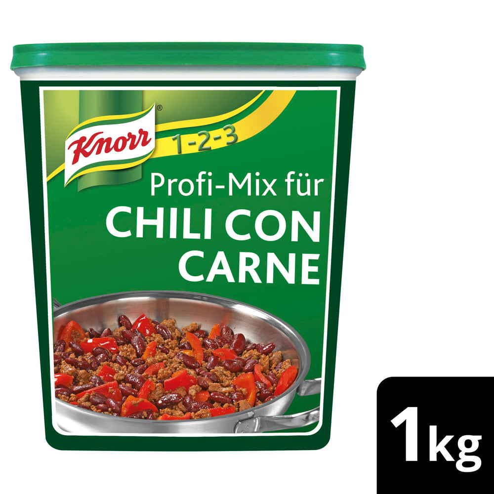 Zubereitung: 1. 4 kg Hackfleisch anbraten. 2. 4 kg rote Bohnen (Dose) und 6 l Wasser zugeben. 3. Packungsinhalt Profi-Mix einrühren und aufkochen, unter gelegentlichem Rühren ca. 15-20 min. bei schwacher Hitze weiterkochen.