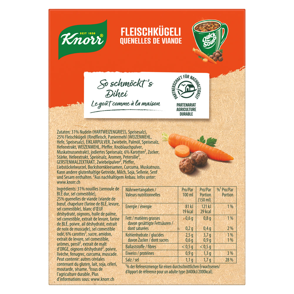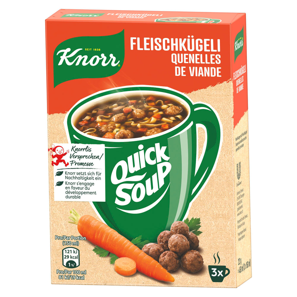 - Die KNORR Quick Soup Fleischkügeli Suppe 3 x 1 Tasse ist die perfekte Suppe, wenn es mal schnell gehen muss