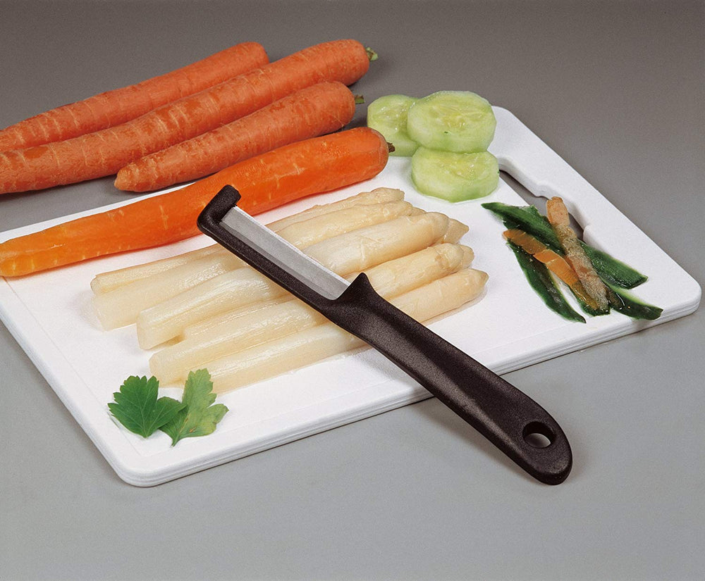 Schnelles Schälen von Obst und Gemüse ist mit dem Spargelschäler von Fackelmann kein Problem mehr. Der Weltmeister-Spargelschäler wird von dem Spargelschäl-Weltmeister Helmut Zipner empfohlen. Mit seiner beweglichen Klinge passt er sich dem Schälgut optimal an. Außerdem verfügt er über eine lange Schnitthaltigkeit und eignet sich auch sehr gut zum Ausstechen unschöner Stellen am Gemüse. Nach der Verwendung kann der Schäler einfach in der Spülmaschine gereinigt werden.